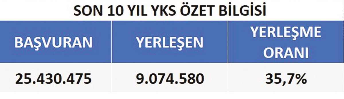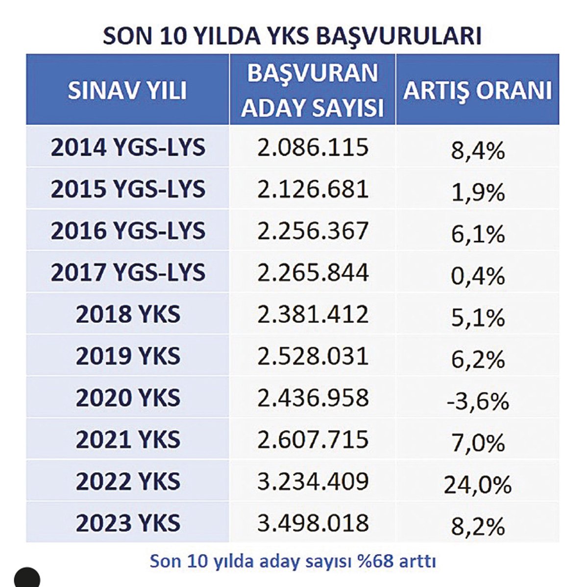 “YKS başvuru artışını sınav barajının kaldırılması, deprem bölgesindeki öğrencilerden başvuru ücreti alınmaması gibi birçok neden etkiledi. Otobüse ve metroya yüzde 50 indirimli binmek için öğrenci pasosu alma amacıyla genç-yaşlı yüzbinlerce aday, üniversite sınavına başvurdu. 2023 YKS’ye başvuranların sadece yüzde 29’u ilk kez sınava girecek olan lise son sınıf öğrencilerinden oluştu. Bu bizi hiç şaşırtmadı.”