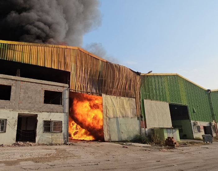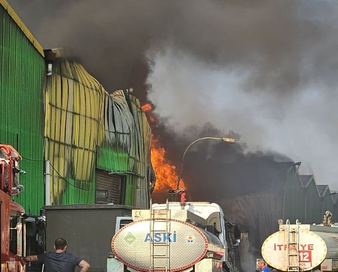 Geri dönüşüm fabrikasında çıkan ve aralarında kolonya fabrikasının da olduğu 18 iş yerine sıçrayan yangının, kontrol altına alındığı kaydedildi. Bölgede ekipler, soğutma çalışmalarını sürdürüyor. (DHA)