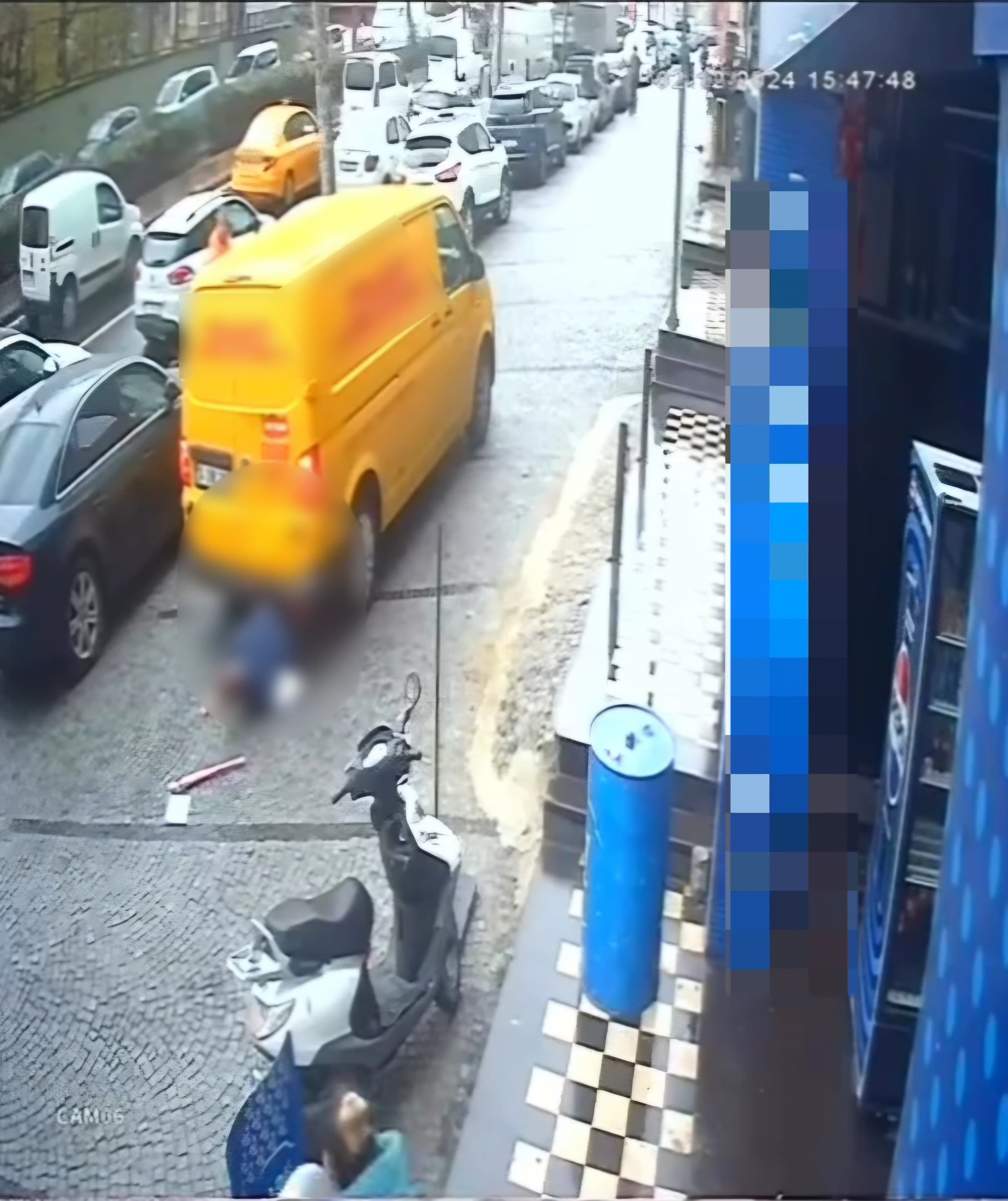 Bayrampaşa'da, bir sitenin otoparkında geri manevra yapan minibüs, arkasında yürüyen kadını fark etmeyerek çarptı. Kadın minibüsün altında kalmaktan son anda kurtuldu.