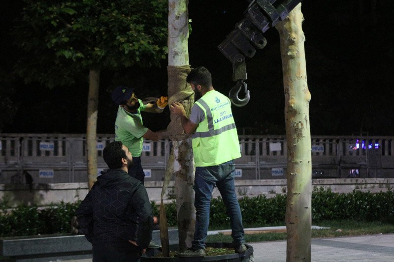 İstanbul Büyükşehir Belediyesi (İBB) Alt Yapı Hizmetleri Müdürlüğü'nce devam eden Taksim Meydanı çevre düzenlemesi çalışmaları kapsamında, meydana dikilecek 50 ağaçtan 20'si gece saatlerinde İstanbul Büyük Şehir Belediyesi ağaç ve peyjaz ekipleri tarafından dikerek ağaçlandırma çalışmaları tamamlandı.