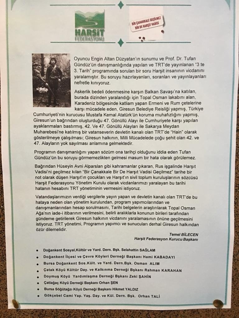 Saygıdeğer Mütevelli Üyelerimiz, çok değerli dostlarımız Türkiye Cumhuriyeti Devletimizin resmi televizyon kanalı olan, ödediğimiz her enerji faturasından pay verdiğimiz ve desteklediğimiz TRT'de yayınlanan bir yarışma programında sorulan bir soru ile , ilimiz Giresun'un ve ülkemiz Türkiye Cumhuriyetinin milli kurtuluş kahramanlarından Milis Yarbay ,Feridunoğlu Gazi Topal Osman Ağamızı tarihi gerçekleri inkar ederek Trabzon Mebusu Ali Şükrü Bey'in katili olarak yansıtan programı, sunucusunu, yapımcısını ve tüm TRT Yönetimini kınıyor ve lanetliyoruz.Tarihi gerçeklere aykırı bu soru ile memleketimizin milli gururu Topal Osman Ağamızın aziz hatırasına saldırı teşkil ederek tüm kamuoyu önünde tahkir ve tezyif eden, ülke insanımıza , özellikle genç nesillerimize bir milli kahramanımızı karalayan bu yayın nedeniyle TRT Televizyonunu özür dilemeye davet ediyoruz. Bu yarışma programı ile verilmek istenen mesaj ve ulaşılmak istenen amaçlara Topal Osman Ağanın Torunları olarak müsaade etmeyeceğiz. 15 Temmuz Hain Darbe girişimi sonrasında Fetö PDY Terör Örgütünün ele geçirdiği anlaşılan TRT 'de , yapılan tüm operasyonlara rağmen milli ve manevi değerlerimize yapılan bu subliminal saldırı , bu kurumda aynı zihniyetin temsilcilerinin uzantılarının hala aktif olduğunun delilidir. Ülkemizin banisi , kurucu lideri Gazi Mustafa Kemal Atatürk'ün koruma birliğini yapan mangal yürekli Topal Osman Ağa ve yiğit uşaklarını yedi ay işgalcilerin işbirlikçilerine karşı bağrına basarak misafir etme şerefini taşıyan şanlı Şebinkarahisarlılar olarak yapılan bu ağır hakareti iade ediyor ve TRT Televizyonunu tarihi gerçeklerle yüzleşmeye davet ediyoruz. Geçmişten bu güne değişik şekillerde oynanmaya çalıştığınız bu oyunla bir şey elde edemeyecek ve bu milletin değerleri üzerinden bizleri bölemeyeceksiniz. Kamuoyuna saygılarımızla duyurulur. İST. ŞEBİNKARAHİSAR VAKFI YÖNETİM KURULU