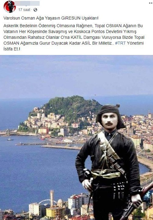 “Topal Osman Ağa vatanın bölünmez bütünlüğü (BEKA için ne gerekiyorsa onu yapmıştır. TRT çalışanlarının içindeki Pontusçu Rumlar Türk milletinin değerlerine yaptığı bu ilk küstahlığı değildir. Şunu anlıyoruz ki, için Topal Osman Ağa’dan yarım kalan işimiz var. Topal Osman Ağa “Vatanın ha ekmeğini yemişim ha uğruna kurşunu” diyerek yola çıkmış milli kahramandır. Türkiye Cumhuriyeti'nin kurucusu Gazi Mustafa Kemal Atatürk’ün yaveri silah arkadaşıdır. Vatan için can alınır, can verilir. Osman Ağa devlet için can alıp can vermiş bir kahramandır. Ruhu şad, mekanı cennet, kabri nur bahçeleri dolsun.”
