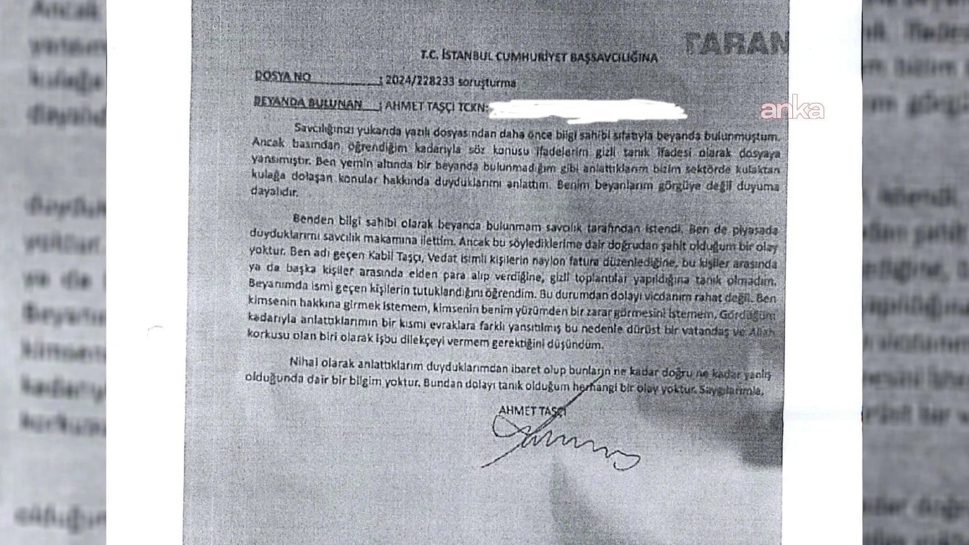 Tanıklıktan çekilen Ahmet Taşçı dilekçesinde şunları söylemişti: