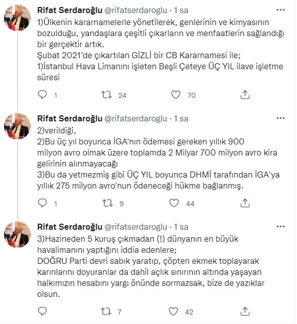 Serdaroğlu, "gizli" bir Cumharbaşkanı Kararnamesi ile İstanbul Havalimanı'nı işleten İGA'ya önemli ayrıcalıklar sağlandığını ileri sürdü.