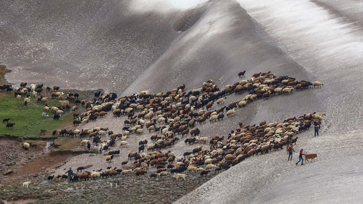 Göç sürecinde yer yer buz ve kar tabakalarından geçmek zorunda kalan sürüler, yaklaşık 1 aylık yolculuk sonrası zengin bitki örtüsüne sahip meralara ulaşıyor.