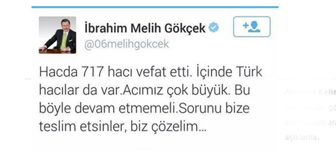 Erdoğan'ın bu açıklamasının ardından Melih Gökçek, Suudi Arabistan'ı eleştiren tweetini sildi. Gökçek, kaldırdığı mesajında şunları yazmıştı.