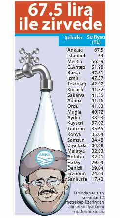 Başkentte son zamla birlikte bir ailenin aylık su faturası en az 100 liraya çıktı. Tüketici Hakları Derneği Başkanı Turhan Çakar, Türkiye’nin en pahalı şehir şebeke suyunun Ankara’da olduğunu söyledi Çakar, “Bu zamla birlikte aradaki makas daha da açıldı” dedi. Tüketici Hakları Derneği’nin yaptığı hesaplamalara göre Türkiye’de en pahalı su Ankara’da, en ucuzu da Şanlıurfa’da.