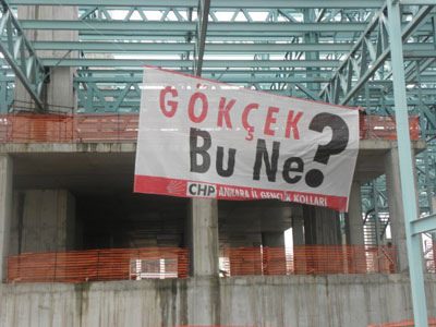 Ankaralıların ne olduğunu bir türlü anlayamadığı demir yığınına, CHP Gençlik Kolları da ilginç bir pankart asmıştı: