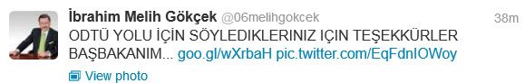 Gökçek, Erdoğan'ın konuşmasının ardından Twitter'daki sayfasında şu ifadelere yer verdi: "ODTÜ YOLU İÇİN SÖYLEDIKLERINIZ IÇIN TEŞEKKÜRLER BAŞBAKANIM.."