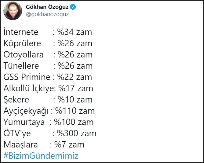 Gökhan Özoğuz 'Bizim gündemimiz' dedi ve zamları tek tek sıraladı