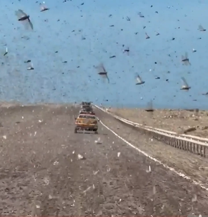 Çöl güzergahında ilerleyen araçlar, gökyüzünü kaplayan yoğun bir çekirge bulutunun içinde kaldı. Sürücülerin görüş mesafesi sıfıra kadar düşerken, çekirgelerin araç camlarına ve kaportalarına çarpmasıyla ilerlemek imkansız hale geldi. Birçok sürücü, ön camlarını kaplayan çekirge tabakası nedeniyle aracını durdurmak zorunda kaldı.