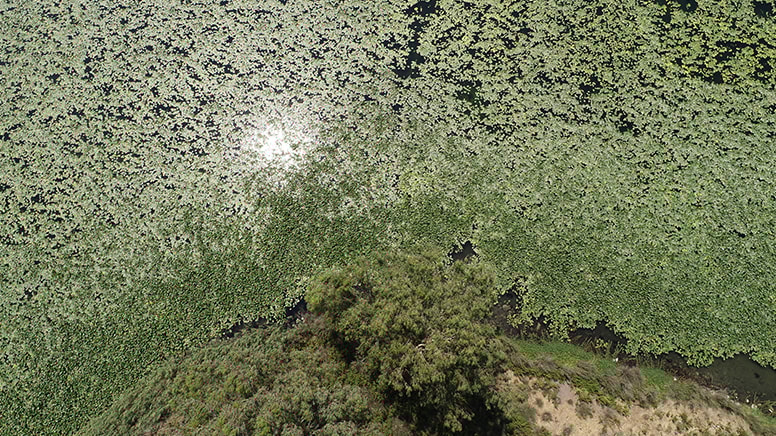 Bazı çocuklar, gölü adeta işgal eden ve yeşile boyayan nilüferlerin arasında serinlemek için yüzüyor.
