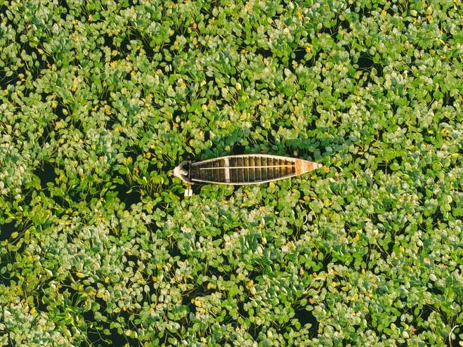 Bazı mahalle sakinleri ve ziyaretçiler, gölü adeta 'işgal eden' ve yeşile boyayan su sümbüllerinin arasında tahta sandallarla gezip balık avlıyor. (AA)