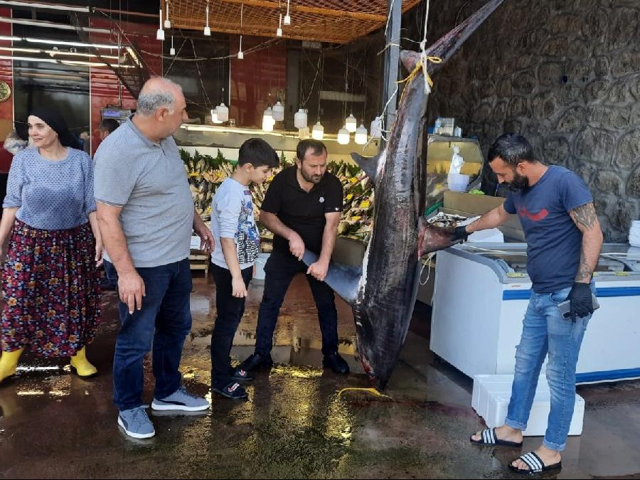 Yakaladıkları balığın müşterilerin ilgisini çektiğini belirten Şahin, "Balığı getirip dükkanımıza astık, gelen müşterilerin çok ilgisini çekiyor vatandaşlarımıza gösteriyoruz. Bazıları fotoğraf bile çektiriyor, Gelen insanların neredeyse tamamı daha önce bu büyüklükte bir camgöz köpek balığı görmediğini söylüyor" diye konuştu. (DHA)