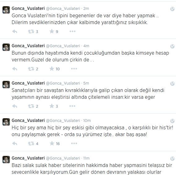 Yalan Dünya dizisinin Vasfiye teyzesi olarak dikkatleri üzerine çeken başarılı oyuncu Gonca Vuslateri Gezi Parkı sürecinde verdiği destek ve dik duruşu sebebiyle pek çok yandaş haber sitesinin hedefi haline geldi. Kendisi hakkında hemen her gün ahlak sınırlarını zorlayan haberler yapılan Gonca Vuslateri en sonunda bu etik dışı uygulamaya dayanamadı ve tepkisini bedduayla gösterdi. İnstagram hesabından paylaştığı fotoğrafının son derece yakışıksız bir şekilde haberleştirilmesine kızan Gonca Vuslateri tepkisini beddua ederek göstermeyi seçmiş işte o beddua ve Vuslateri'nin diğer tweetleri: