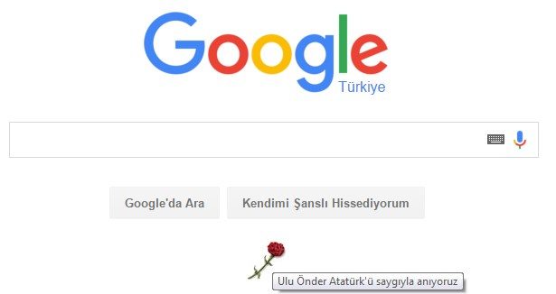 Google, Mustafa Kemal Atatürk'ün ölüm yıldönümü olan 10 Kasım'da "Ulu Önder Atatürk'ü saygıyla anıyoruz" notuyla anasayfasında kırmızı gül fotoğrafı paylaştı.