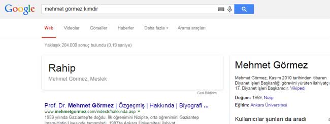 Buna göre arayacağınız kişinin ismini yazıp sonuna “kimdir” diye eklediğiniz de, o ismin mesleği çıkıyor. Aynı aramayı Diyanet İşleri Başkanı Prof. Dr. Mehmet Görmez için yapıldığında ise, "Mesleği: Rahip” sonucunu veriyor. Birçok isme dair arama yapıldığında herhangi bir yanlışlık olmazken, Mehmet Görmez’in mesleği için Hristiyan din adamlarına verilen “rahip” unvanının çıkması dikkat çekiyor.