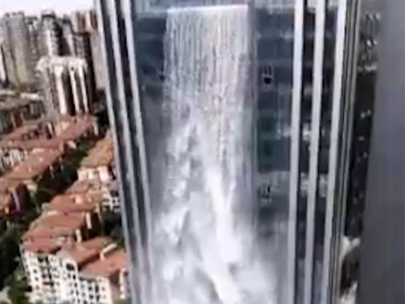 Çin’de 121 metre yüksekliğindeki gökdelende yapay bir şelale oluşturuldu.