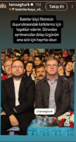"Baletler Köyü filmimizin duyurulmasındaki katkılarınız için teşekkür ederim. Görevden ayrılmanızdan dolayı üzgünüm ama sizin için hayırlısı olsun"