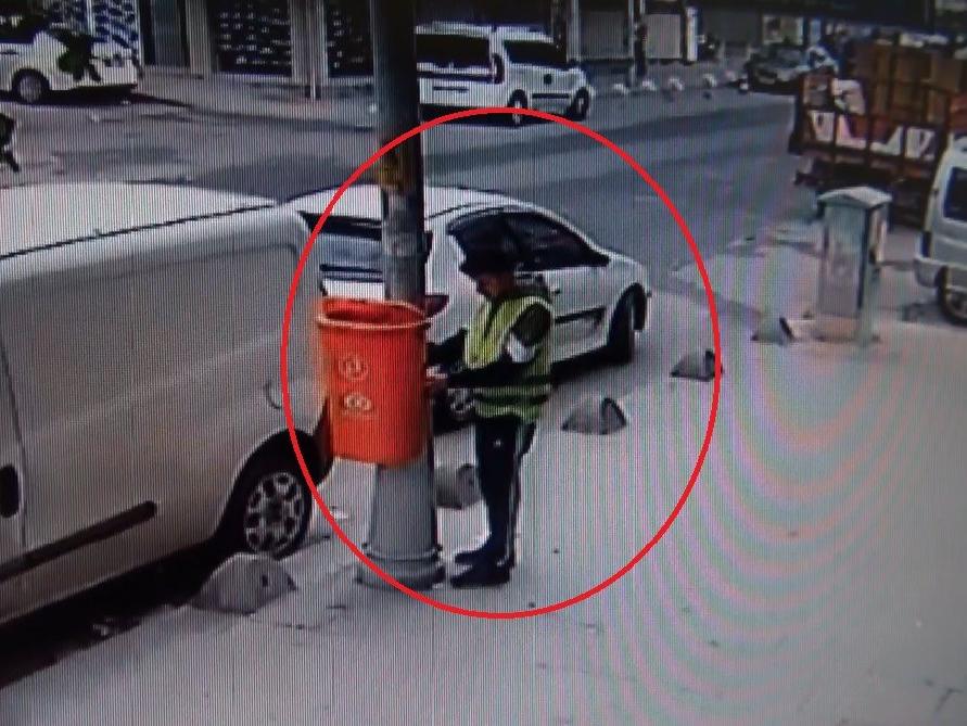 İki arkadaşının uzaklaşmasından sonra ise etrafı gözetlemeye devam etti. Görüntülerde tedirgin olduğu da görülen kişi, daha sonra park halindeki aracına doğru yöneldi. Araçtan aldığı ikaz yeleğini giyerek kendisine belediye personeli süsü veren kişi, aydınlatma direğinin koruyucu kapaklarını elindeki tornavida ile söktü. Kapakları araca yükleyen şüpheli, caddeden uzaklaştı.