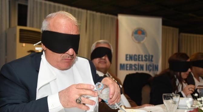 MERSİN'de, 7-14 Ocak Beyaz Baston Görme Engelliler Haftası nedeniyle düzenlenen 'Karanlıkta Yemek' adlı farkındalık etkinliğine, protokol üyeleri siyah bantla gözlerini kapatıp yemek yiyerek, görme engellilerle empati kurmaya çalıştı.