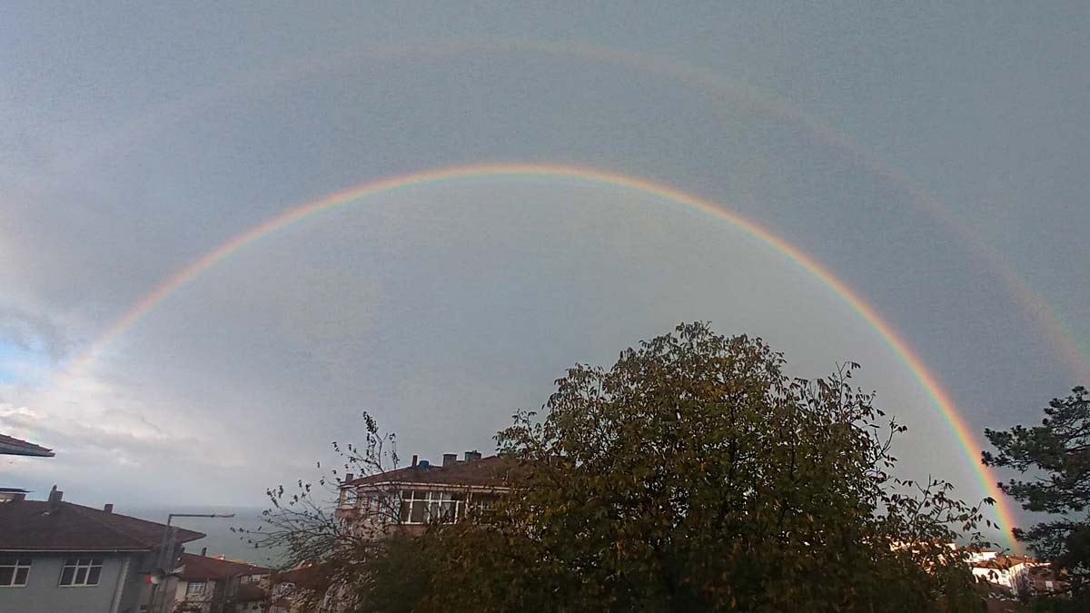 Alaplı ilçesinde sabah saatlerinde etkili olan sağanak yerini güneşli havaya bıraktı. Güneşin etkisiyle gökyüzünde çifte gökkuşağı oluştu.