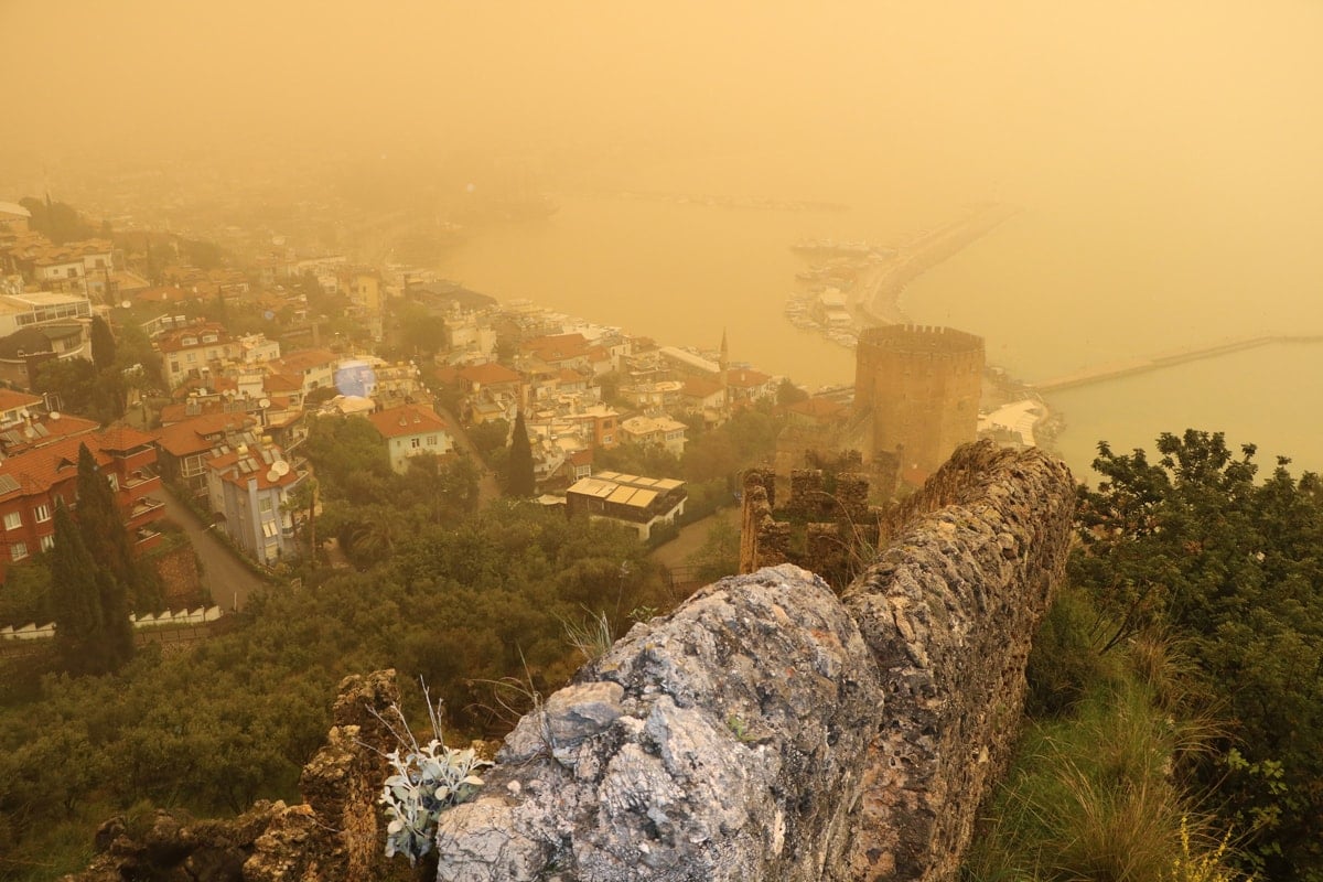 Antalya'nın Alanya ilçesinde gökyüzü Afrika'dan gelen çöl tozu nedeniyle turuncuya büründü.