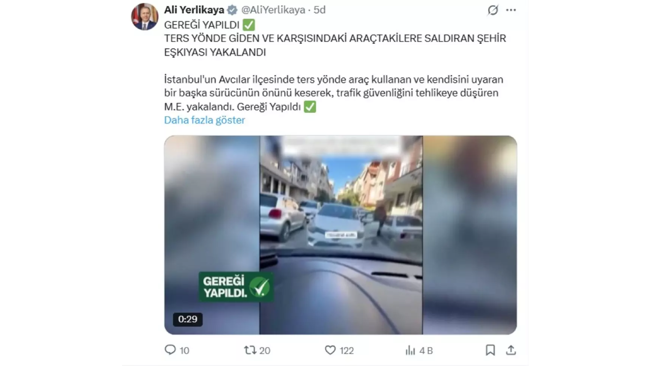 Avcılar Denizköşkler Mahallesi'nde meydana gelen olayda, tek yön olan Sülün Sokak'ta ilerleyen Mustafa Morbel, ters yönden gelen sürücüye geri gitmesi için uyarıda bulunmuştu. Sürücü yol ortasında dururken, görüntülendiğini fark ederek araçtan inmişti. "Niye görüntü alıyorsun" diyerek tepki gösteren sürücü, ters yön uyarısında bulunan Mustafa Morbel'e saldırmıştı. Bakan Yerlikaya o magandanın cezasız kalmadığını açıkladı.