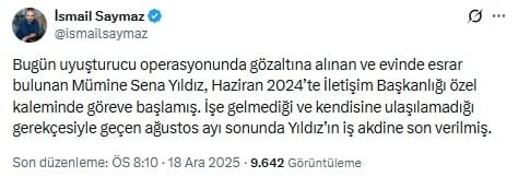 "Bugün uyuşturucu operasyonunda gözaltına alınan ve evinde esrar bulunan Mümine Sena Yıldız, Haziran 2024’te İletişim Başkanlığı özel kaleminde göreve başlamış. İşe gelmediği ve kendisine ulaşılamadığı gerekçesiyle geçen ağustos ayı sonunda Yıldız’ın iş akdine son verilmiş."