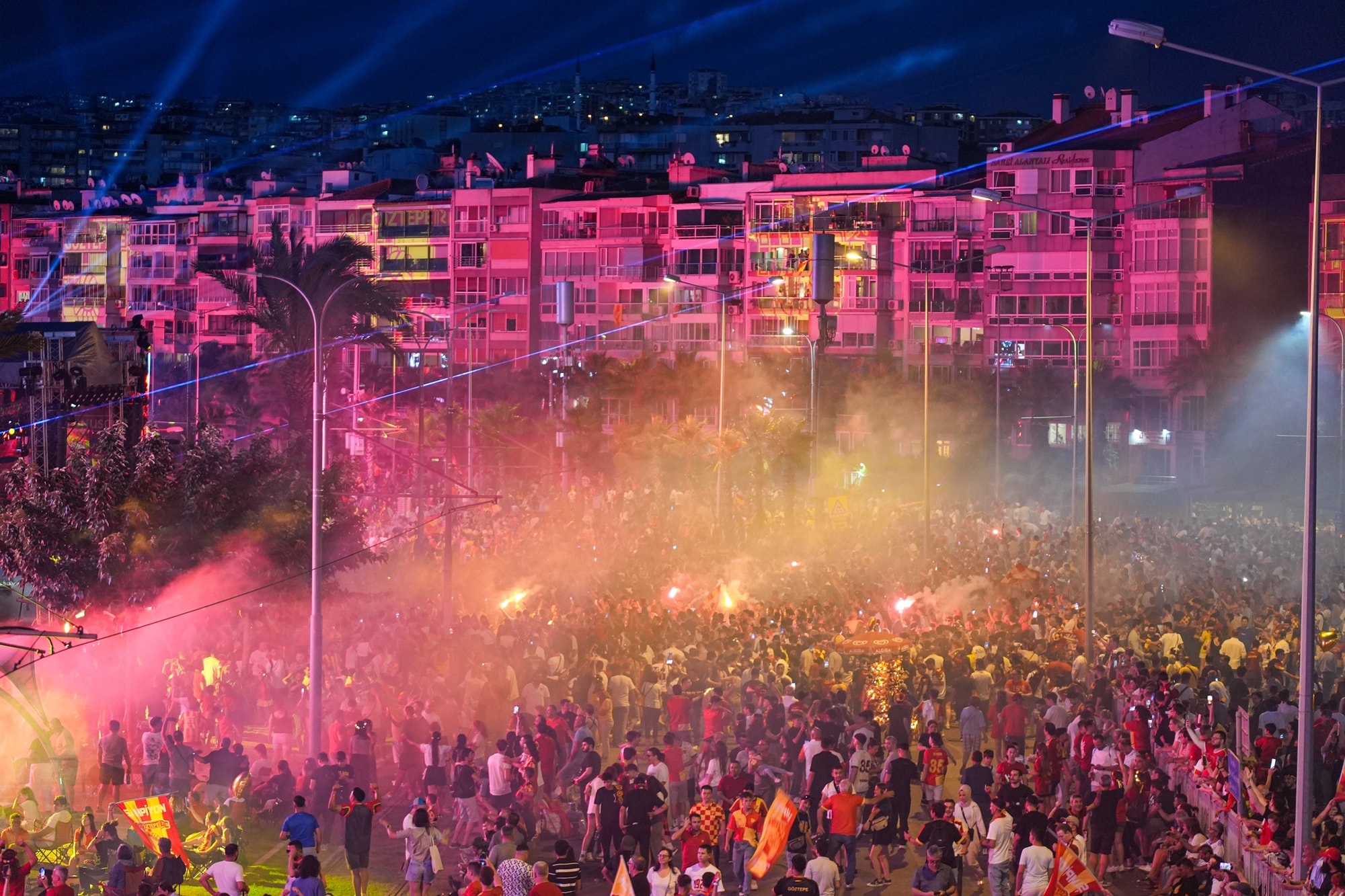 Burada gerçekleştirilen müzik ve ışık şovlarıyla eğlenen sarı-kırmızılı taraftarlar, saat 22.00'de aynı anda meşalelerini yaktı. Taraftarların sahil boyunca yaktığı meşaleler geceyi aydınlatırken, denizdeki teknelerden de havai fişek gösterisi yapıldı.