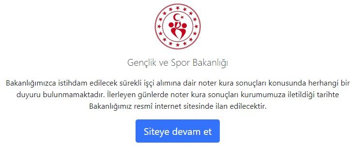 Gençlik ve Spor Bakanlığı personel alımı kura sonuçları için yapılan açıklamada; “Bakanlığımızca istihdam edilecek sürekli işçi alımına dair noter kura sonuçları konusunda herhangi bir duyuru bulunmamaktadır. İlerleyen günlerde noter kura sonuçları kurumumuza iletildiği tarihte Bakanlığımız resmî internet sitesinde ilan edilecektir.” sözlerine yer verildi. İŞKUR GSB kura sonuçlarının bir iki gün içinde açıklanması bekleniyor fakat henüz tam tarih belli değil.