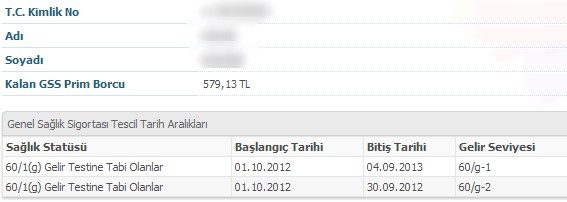 Kişilerin gelir testine girmeden önce en üst seviyeden prim borçlanması yapılır. Gelir testi konusunda herhangi bir bilgisi olmayan ve prim ödemelerini hangi gelir seviyesinden yaptığını öğrenmek isteyen kişiler ise GSS sorgulama yapabilir. İlgili sorgulama sonrasında bakılması gereken ekran şöyledir;