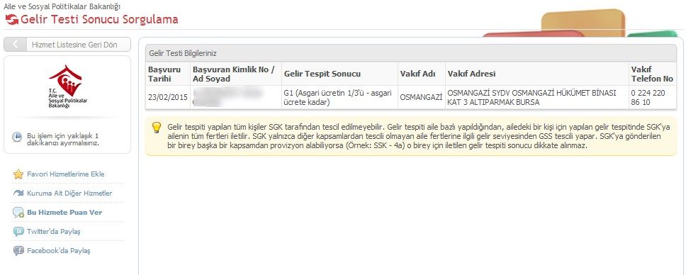 Bu ekranda kişilerin GSS gelir testi işlemleri için giriş yapması istenir. Giriş sonrasında ise GSS gelir testi işlemleri için aşağıdaki resimde görüldüğü gibi detaylı bir tablo yayınlanır. Tablo sayesinde kişilerin hangi gelir seviyesinde olduğu, GSS gelir testi işlemlerinin hangi birim tarafından yapıldığı, ilgili birimin telefon numarası ve adresi gibi tüm detaylar yer alır. Böylece kişiler kolay bir şekilde gelir testi ile ilgili durumunu takip edebilir.