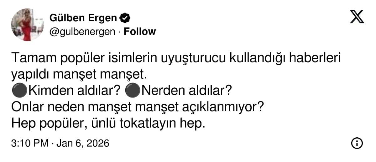 Bu durumun ardından Gülben Ergen, operasyon haberlerinde sürekli ünlülerin hedef alınmasına tepki gösterdi. "Hep ünlüleri tokatlayın" ifadesini kullanan Ergen, asıl üzerinde durulması gereken konunun bu maddelerin kimler tarafından ve hangi yollarla temin edildiği olduğunu vurguladı.