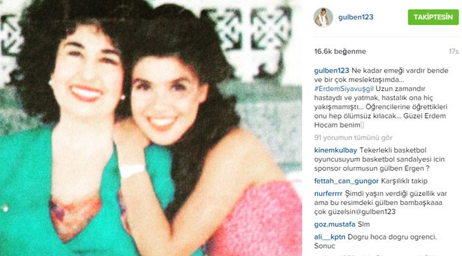 Instagram sayfasında Erdem Siyavuşgil ile fotoğrafını paylaşan Ergen, ''Ne kadar emeği vardır bende ve bir çok meslektaşımda... #ErdemSiyavuşgil Uzun zamandır hastaydı ve yatmak, hastalık ona hiç yakışmamıştı... Öğrencilerine öğrettikleri onu hep ölümsüz kılacak... Güzel Erdem Hocam benim...'' notunu düştü.
