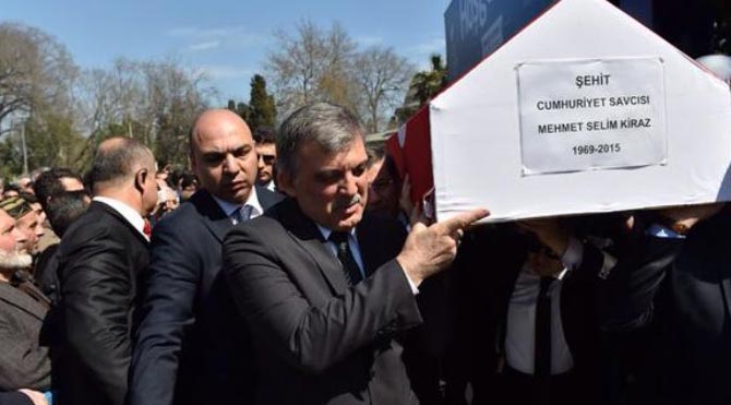Şehit Savcı Mehmet Selim Kiraz'ın Eyüp Sultan Camii'ndeki cenaze törenine katılan 11. Cumhurbaşkanı Abdullah Gül, twitter hesabından fotoğraf paylaştı. Gül'ün paylaştığı fotoğrafta Kiraz'ın tabutuna omuz verdiği görülüyor. Abdullah Gül, paylaştığı fotoğrafla ilgili de "Teröristlerce şehit edilen Savcı Mehmet Selim Kiraz'ın cenaze törenine katıldık. Kendisine Allah'tan rahmet, ailesine ve milletimize yeniden başsağlığı diliyorum. Millet olarak terör olayları karşısında farklı düşüncelerimizi bir yana bırakıp, birlik ve beraberlik içerisinde olmalıyız" mesajını yazdı.