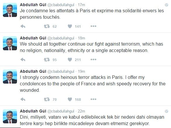 11. Cumhurbaşkanı Abdullah Gül, katliam sonrasında İngilizce, Fransızca ve Türkçe mesajlar yayımladı. Gül saldırıyla ilgili, "Paris'teki hain terör saldırısını lanetliyorum. Yaralılara acil şifalar, tüm Fransa halkına başsağlığı diliyorum. Dini, milliyeti, vatanı ve kabul edilebilecek tek bir nedeni dahi olmayan teröre karşı hep birlikte mücadeleye devam etmemiz gerekiyor" ifadelerini kullandı.