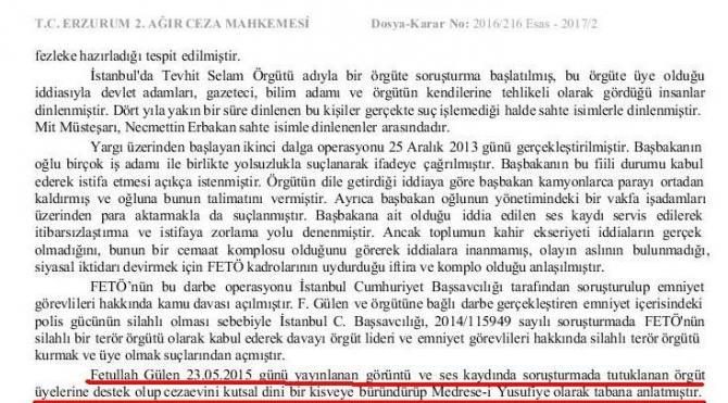 "Fethullah Gülen 23 Mayıs 2015 günü yayınlanan görüntü ve ses kaydında soruşturmada tutuklanan örgüt üyelerine destek olup cezaevini kutsal dini bir kisveye büründürüp Medrese-i Yusufiye olarak tabana anlatmıştır. 'Girdikleri gibi çıksınlar' diyerek İstanbul'daki bazı örgüt üyelerine emir vermiş ve bu emir üzerine cezaevindekilerin bazıları tahliye edilmeye çalışılmıştır. Fethullah Gülen bu konuşmasında tutuklu olan kişileri sahiplenip onların yaptıklarını tasvip ederek emri ile bu işlerin gerçekleştirildiğini zımnen kabul etmiştir. Örgüt, ya taşeron bir başka terör örgütünü kullanarak eylemini onun eliyle icra etmekte, ya da örgüte bağlı devlet kurumlarında yerleştirdiği kamu görevlilerine (gerçekte örgüt fedailerine) kamu gücünü kullandırarak bir devlet göreviymiş görüntüsü altında eylemini icra ettirmektedir. Bu yöntemlerle örgüt hem deşifre olmamakta, hem suçun sorumluluğunun doğrudan muhatabı haline gelmemekte, hem de terör maksadını başarılı bir şekilde gizlemektedir. Devletin tepkisi ve toplumun desteğini kesmesinden çekinen FETÖ, eylemlerini gizlilik içinde kamu kurumlarındaki kadroları eliyle bir kamu hizmetini gerçekleştirme kılıfına büründürerek icra etmektedir. Ancak her terör örgütü gibi FETÖ de nihai hedefi elde etmek üzere 17 Aralık 2013 günü harekete geçerek halen elinden gelen bütün gayreti gösterip doğrudan devleti hedef alan terör faaliyetlerini icra etmiştir. Bu faaliyetleri örgüt, önderinin açıklamaları ve basın yayın araçlarıyla üstlenmiş ve emriyle hareket edenlerin icra ettiğini kamuoyu önünde kabul ettiği görülmüştür."