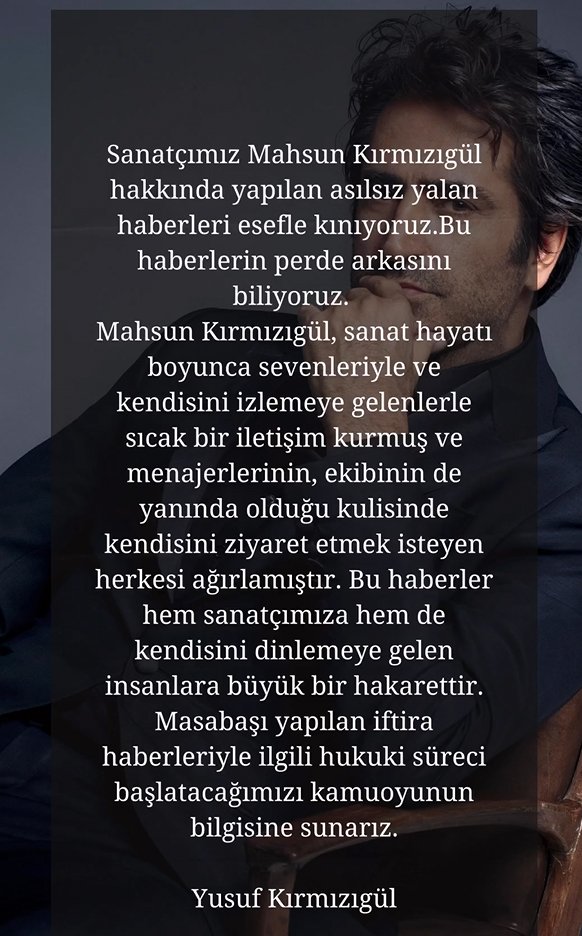 * Sanatçımız Mahsun Kırmızıgül hakkında yapılan asılsız ve yalan haberleri esefle kınıyoruz. Bu haberlerin perde arkasını biliyoruz.