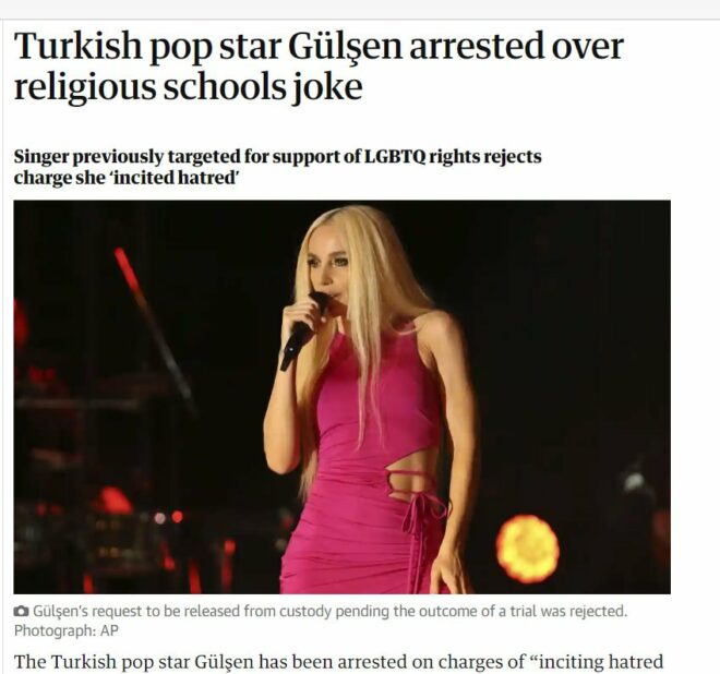 The Guardian: İngiltere'nin köklü gazetelerinden The Guardian, Gülşen'in tutuklanmasını, "LGBTİ'ye verdiği destekle de tanınan şarkıcı halkı kin ve düşmanlığa tahrikten tutuklandı." sözleriyle duyurdu. Gazete, tutuklamanın Erdoğan ve destekçilerinin sosyal medyada başlattığı kampanya sonrası geldiğine dikkat çekti. The Guardian, "Daha önce konserlerinde giydiği kıyafetler ve LGBTİ bayrağı açması nedeniyle muhafazakar çevrelerde hedef haline gelen Gülşen, şakanın yol açtığı hakaretten dolayı özür diledi ancak tutuklanmasının önüne geçemedi." ifadesini kullandı. Gazete, CHP lideri Kemal Kılıçdaroğlu'nun Gülşen'e destek verdiğini de yazdı.