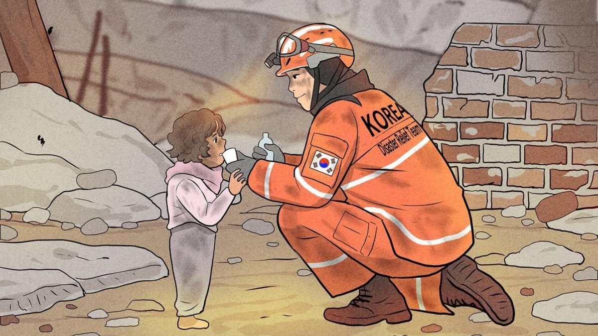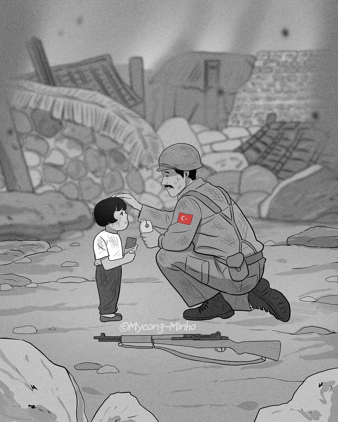 Güney Koreli çizer Myeong Minho, 6 Şubat'ta meydana gelen depremler sonrasında taziye mesajını anlamlı bir çizim yaparak Türkiye ile Güney Kore arasında 73 yıl öncesine uzanan kardeşlik bağlarıyla tasvir etti.