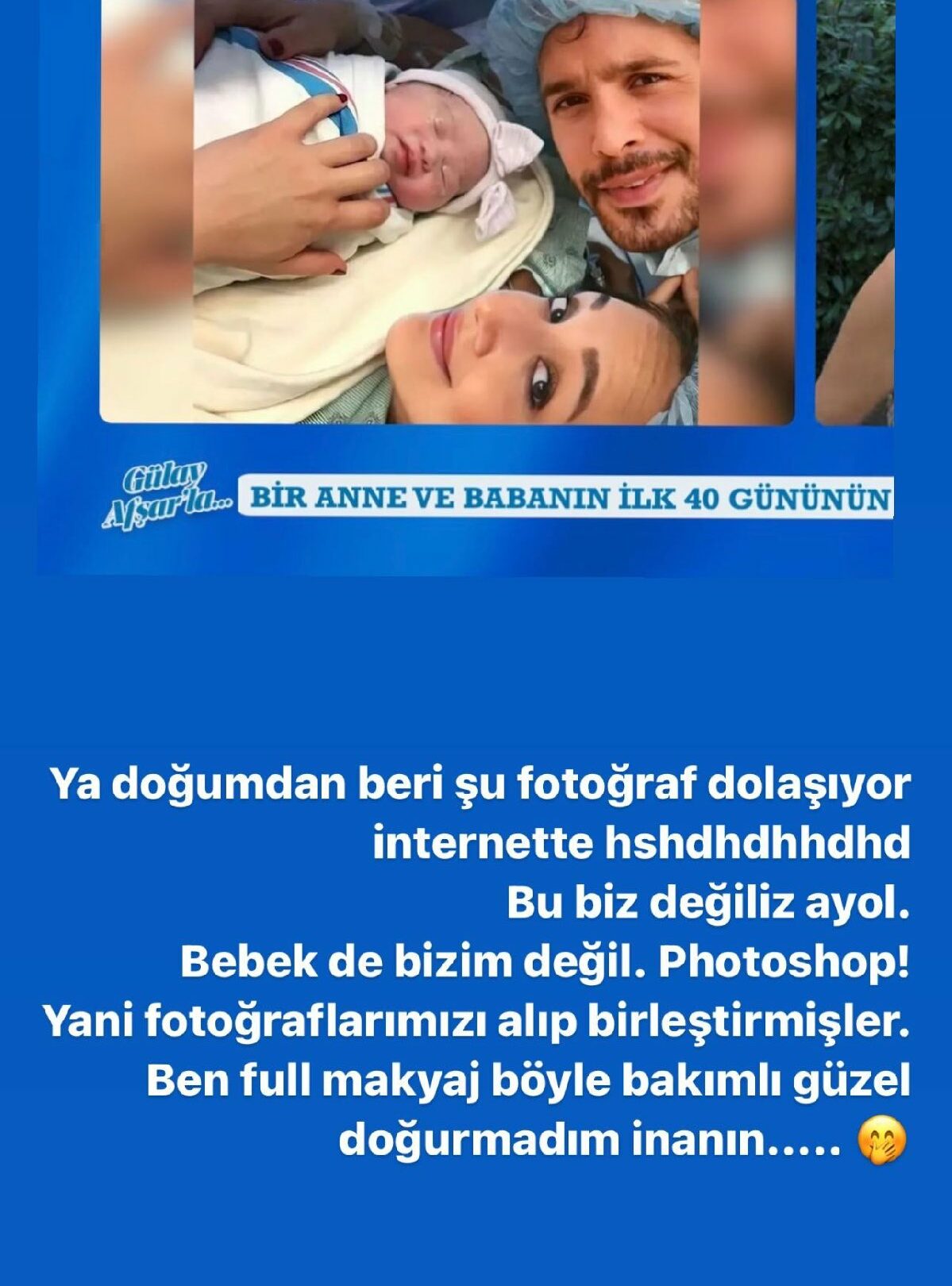 Özay, "Doğumdan beri şu fotoğraf dolaşıyor internette. Bu biz değiliz ayol. Bebek de bizim değil. Photoshop! Yani fotoğraflarımızı alıp birleştirmişler! Ben full makyaj böyle bakımlı güzel doğurmadım inanın" ifadelerini kullandı.