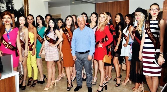 BODRUM'da yapılacak 'Miss 7 Continents - 7 Kıtanın Güzeli' yarışmasına katılmak üzere kente gelen 7 kıtadan 22 güzel, Belediye Başkanı Mehmet Kocadon'u makamında ziyaret etti.