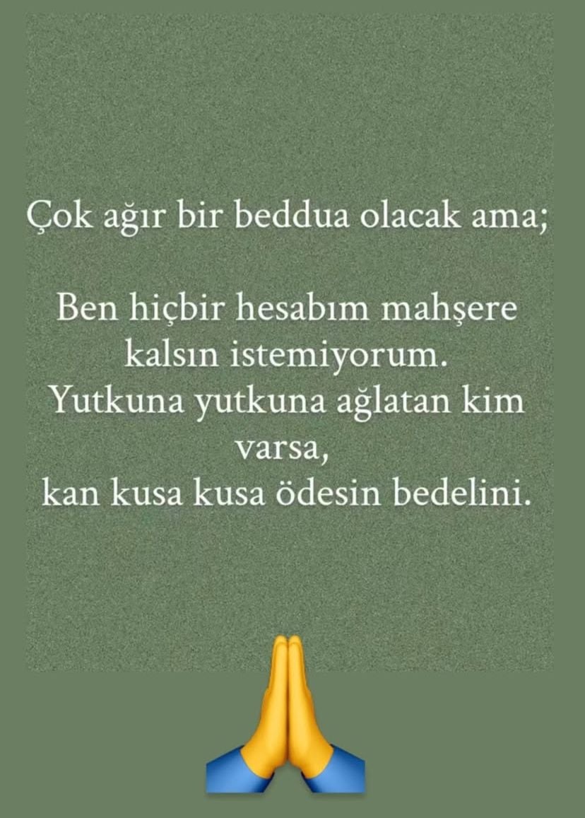 Duran "Çok ağır bir beddua olacak ama, ben hiçbir hesabım mahşere kalsın istemiyorum Yutkuna yutkuna ağlatan kim varsa, kan kusa kusa ödesin bedelini" ifadelerini kullandı.