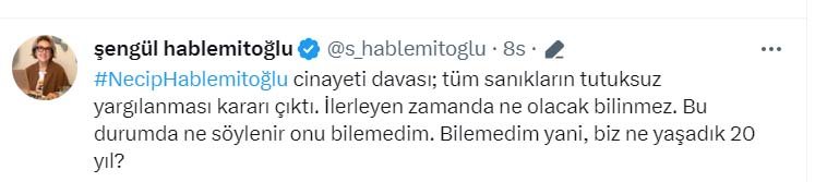 Mahkemenin kararına Hablemitoğlu'nun eşi Şengül Hablemitoğlu tepki gösterdi. Sosyal medya hesabından hesabından paylaşım yapan Hablemitoğlu, "İlerleyen zamanda ne olacak bilinmez. Bu durumda ne söylenir onu bilemedim. Bilemedim yani, biz ne yaşadık 20 yıl?" ifadelerini kullandı.