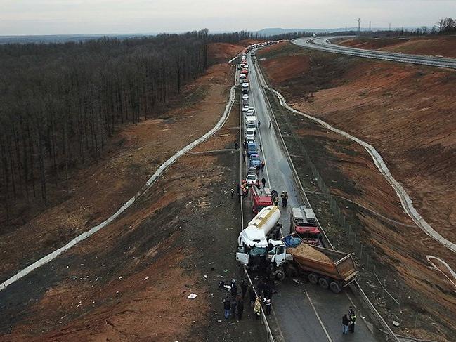 Kaza nedeniyle yol trafiğe kapanırken, yaklaşık 2 kilometrelik araç kuyruğu oluştu. Kaza yapan araçları kaldırma çalışmaları başladı. (DHA)