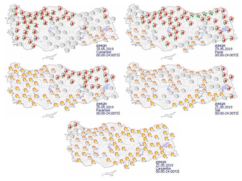 Hafta sonu yurdun özellikle batı ve kuzey bölümlerinde etkili olacak sağanak yağışlar pazar etki alanını daraltsada etkili olmaya devam edecek. Meteoroloji tarafından yayınlanan 5 günlük hava durumu raporu şu şekilde;