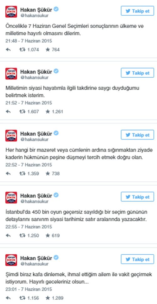 Bağımsız aday olarak seçime giren ve seçilemeyen Hakan Şükür, Twitter'da ''İstanbul'da 450 bin oyun geçersiz sayıldığı bir seçim gününün detaylarını sanırım siyasi tarihimiz satır aralarında yazacaktır'' dedi.
