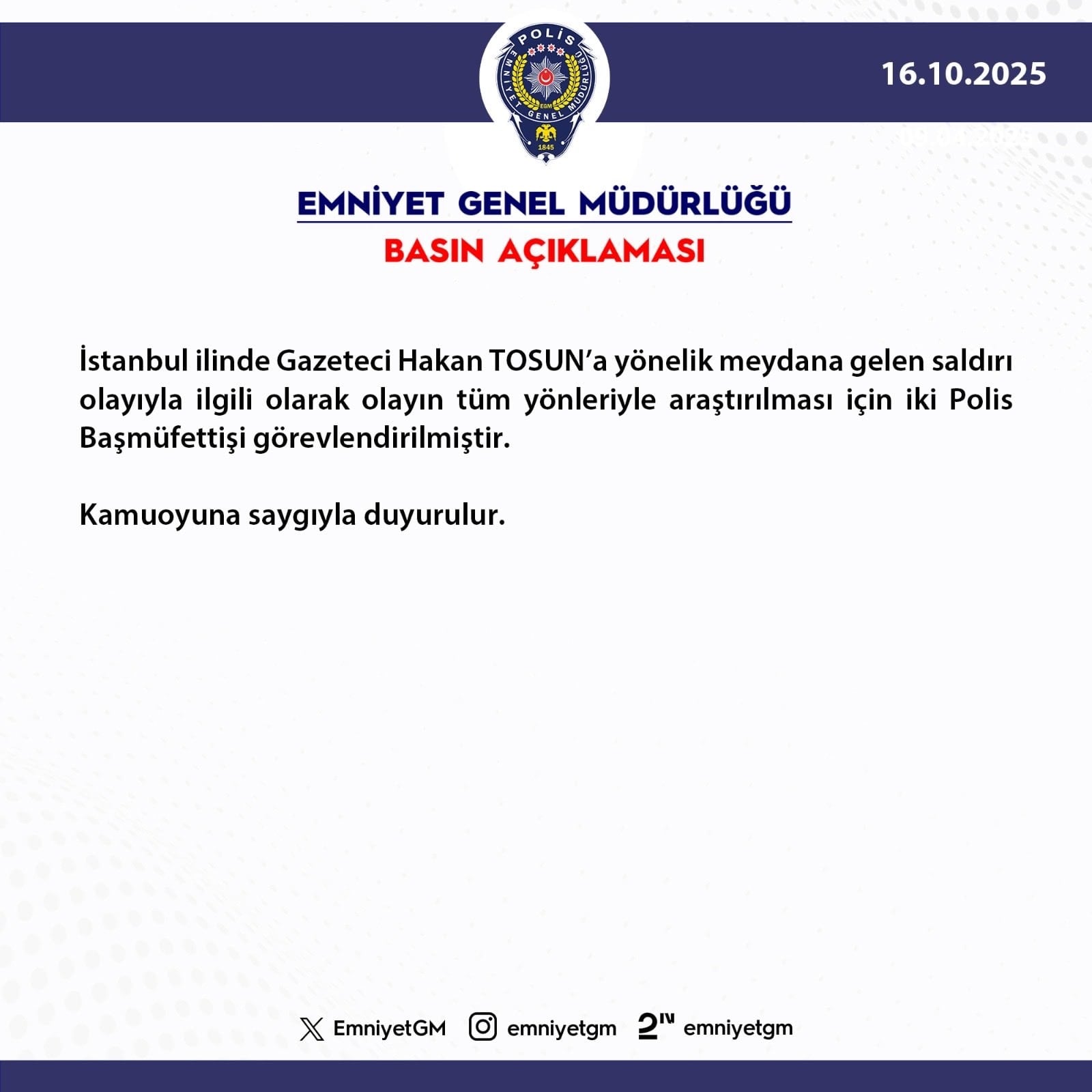 "İstanbul ilinde Gazeteci Hakan Tosun'a yönelik meydana gelen saldırı olayıyla ilgili olarak olayın tüm yönleriyle araştırılması için iki Polis Başmüfettişi görevlendirilmiştir."