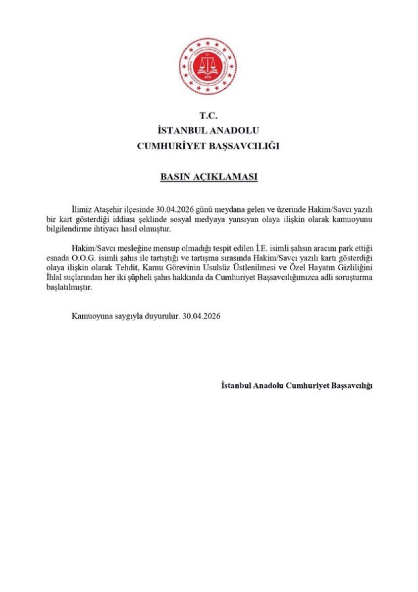 İstanbul Ataşehir’de, iki sürücü arasında çıkan park yeri tartışmasında üzerinde 'Hakim-Savcı' yazılı kart gösteren İ.E.'nin sahte kart gösterdiği tespit edildi. Sosyal medyaya yansıyan görüntüleri ihbar olarak değerlendirilmesinin ardından İ.E.'nin hakim ya da savcı olmadığı belirlendi.
